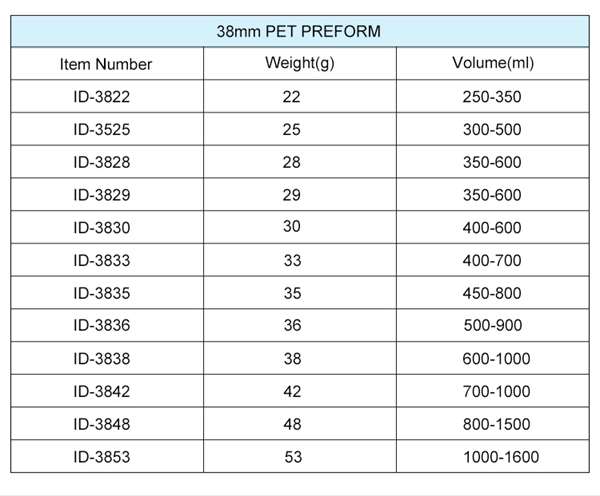 In addition to our wide range of offerings, we provide exceptional custom design services for PET preforms. We have the capability to manufacture bottles in multiple shapes and sizes, and we take pride in helping businesses bring their vision to life. Take a look through our catalog below to see if the perfect PET preform solution for you is already available.s, and solvents — which is particularly crucial for packaging foods and beverages.